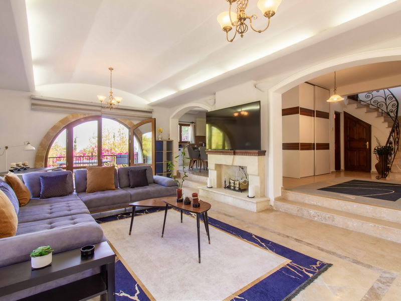 Im Inneren der Villa bietet das Erdgeschoss eine geräumige Eingangshalle, ein Wohnzimmer mit Kamin, eine gut ausgestattete Küche und ein Schlafzimmer. Das Wohnzimmer und der Essbereich führen zu einer Terrasse.